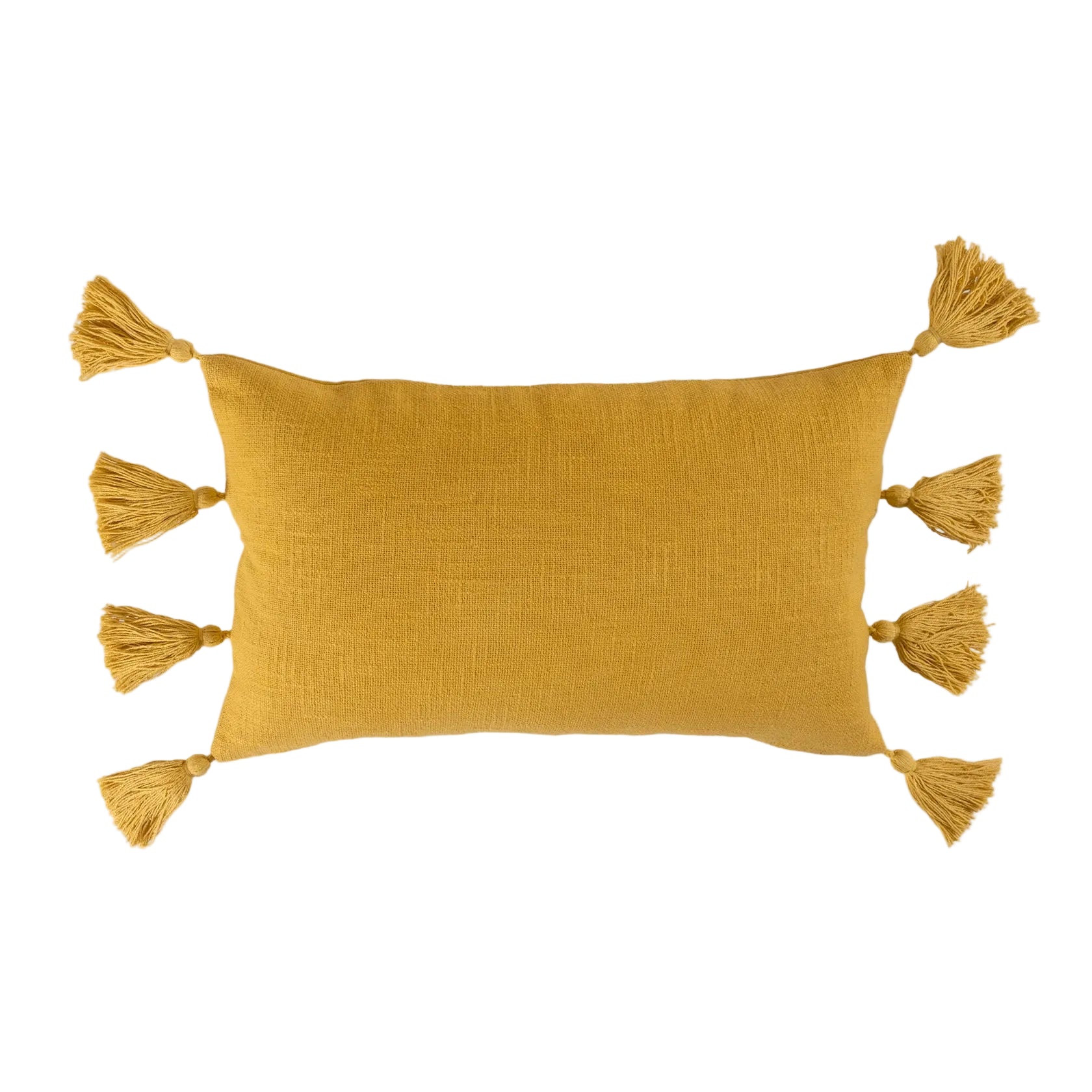 Funda de cojín de Mumbai Mostaza Con Pompones, una de nuestras líneas exclusivas por sus materiales y tejidos premium, Añade estilo y sofisticación a tus espacios, y la podrás combinar con más diseños para crear un conjunto completo y coordinado.
